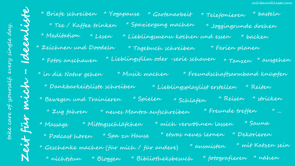 Ich habe mich in meinem Freundeskreis und meiner Instagram-Community umgehört und stelle dir hier eine Ideenliste als Inspirationsquelle für mehr Zeit für dich zur Verfügung.